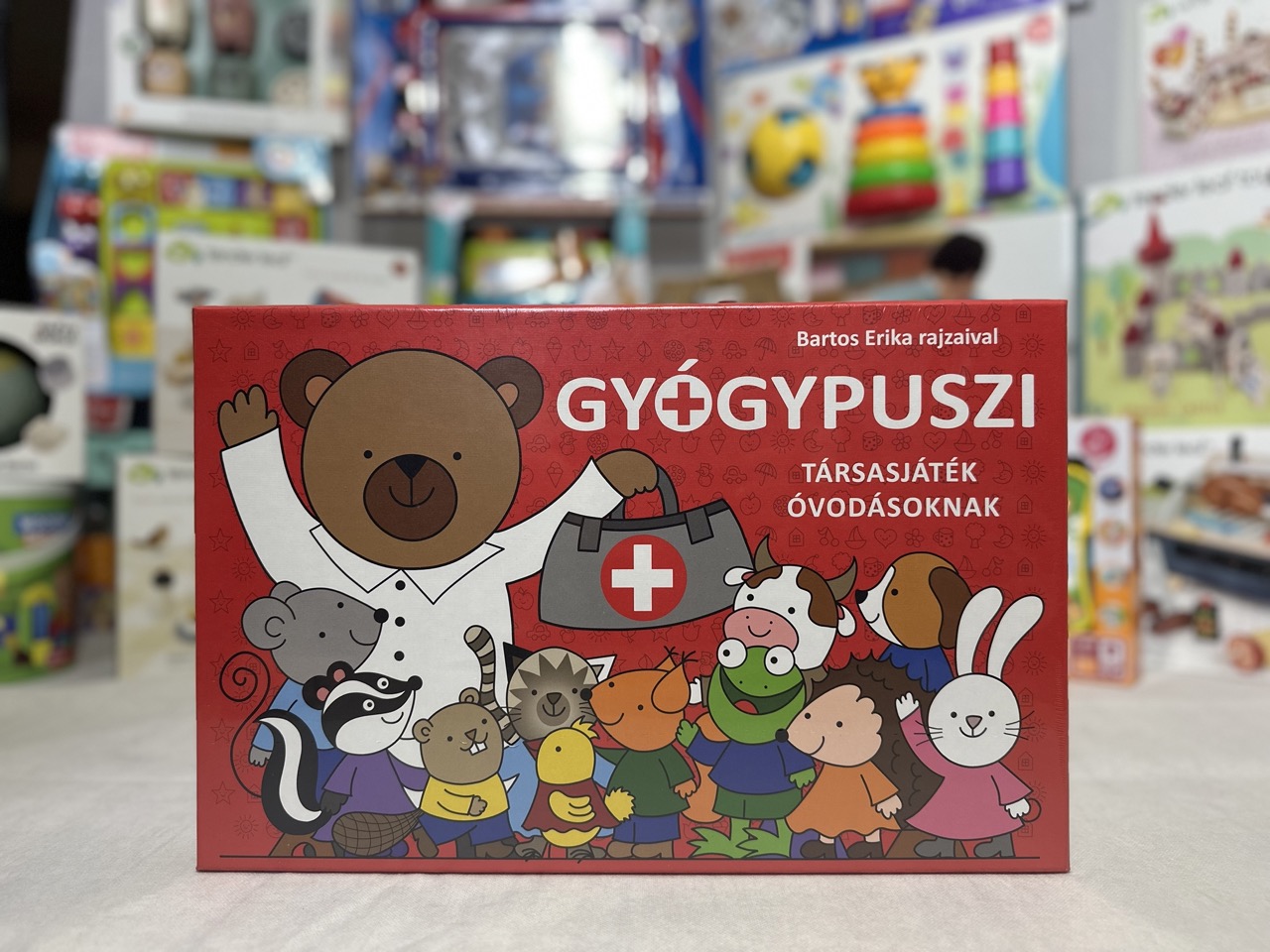 Játékosok száma: 2-4 játékos. Fedezze fel a Gyógypuszi társasjátékot, ahol a kedvenc mesefigurák életre kelnek! Bartos Erika Gyógypuszi mesekönyveinek olvasói most játék formájában is találkozhatnak a szeretett karakterekkel. A játékban Brummbrumm doktor rendelőjébe érkező állatok – a cica, a béka, az egérke és a csibe – mind-mind megkapják a szükséges ellátást a gondos mackó doktortól. A Gyógypuszi játék nem csak szórakoztató, hanem oktató jellegű is, hiszen a gyermekbetegségeket bemutató mesekönyvek szellemében készült. A lépegetős társasjáték, amely az „Úton az oviba” klasszikus játékhoz hasonló, egy rendkívül látványos és részletgazdag játéktáblával büszkélkedhet. A játék során a gyerekek nem csak a figurák mozgatásával sajátíthatják el a sorrendiség és a számolás alapjait, hanem a böngésző/képkereső játékszabály révén fejleszthetik megfigyelőképességüket és kép-associációs készségüket is. A társasjáték tartalma: 1 játéktábla: 46 x 33 cm, középen félbehajtva 4 fabábu: sárga, piros, kék, zöld, 1 számos dobókocka 2 db lap játékszabály, ami egyben böngésző is. A doboz mérete: 40 cm x 27 cm